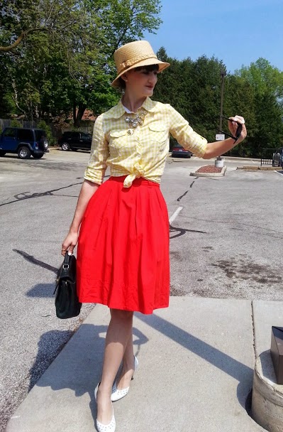 ReplyDeleteEeep! I'm really loving the 50s vibe from this outfit. Your cherry red skirt looks absolutely twirl-licious. And that gingham pairs so well with it.